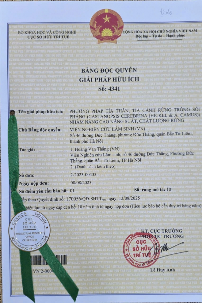 Giải pháp hữu ích này là kết quả của quá trình nghiên cứu, thử nghiệm và ứng dụng thực tiễn trong lĩnh vực lâm sinh, góp phần giải quyết những vấn đề thực tiễn đặt ra trong sản xuất và quản lý rừng, đồng thời mang lại hiệu quả kinh tế – xã hội cao.
