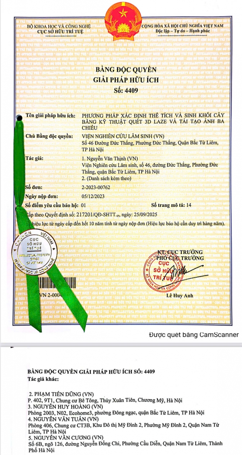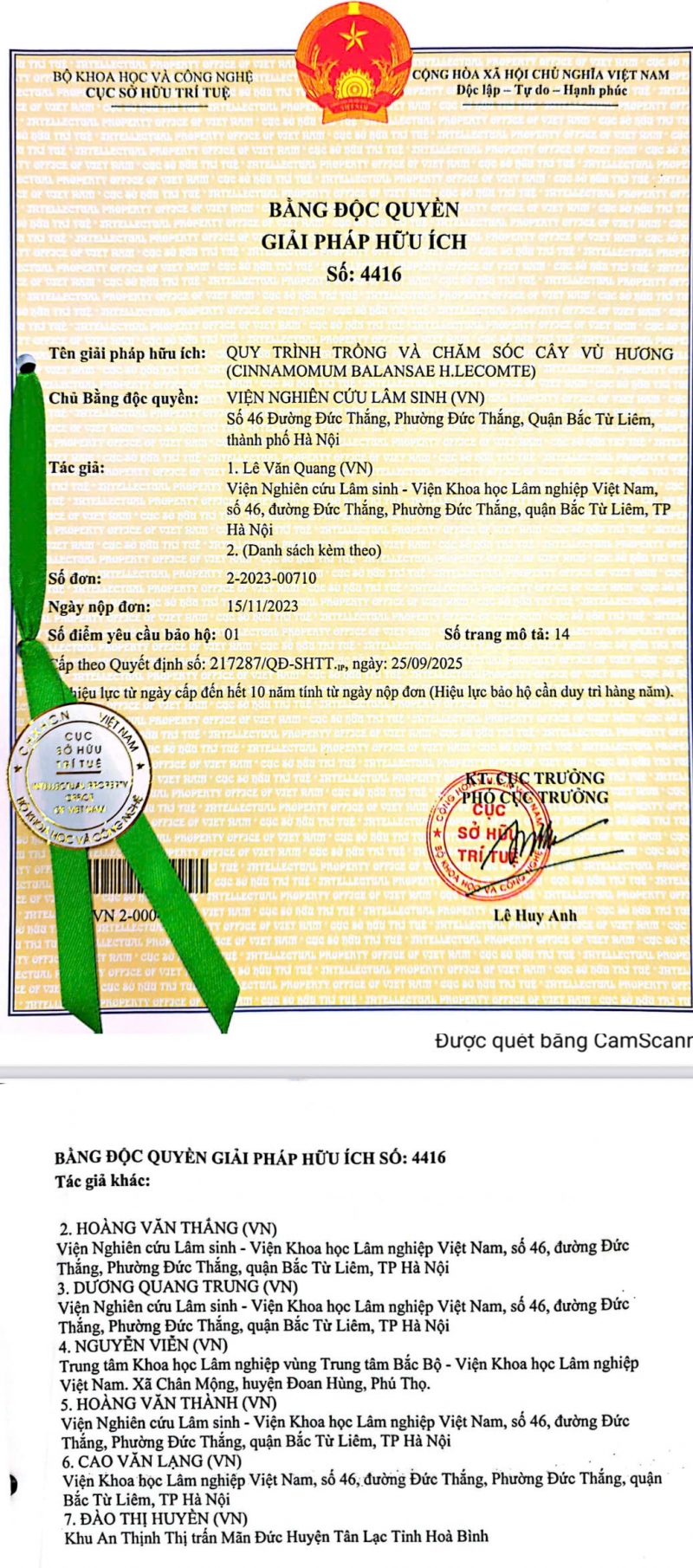 Trong tháng 9/2025, Viện Nghiên cứu Lâm sinh (Viện Khoa học Lâm nghiệp Việt Nam) đã vinh dự được Cục Sở hữu trí tuệ – Bộ Khoa học và Công nghệ cấp hai Bằng độc quyền Giải pháp hữu ích (GPHI), khẳng định những nỗ lực không ngừng trong nghiên cứu, sáng tạo và ứng dụng khoa học công nghệ vào thực tiễn sản xuất lâm nghiệp.