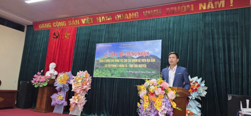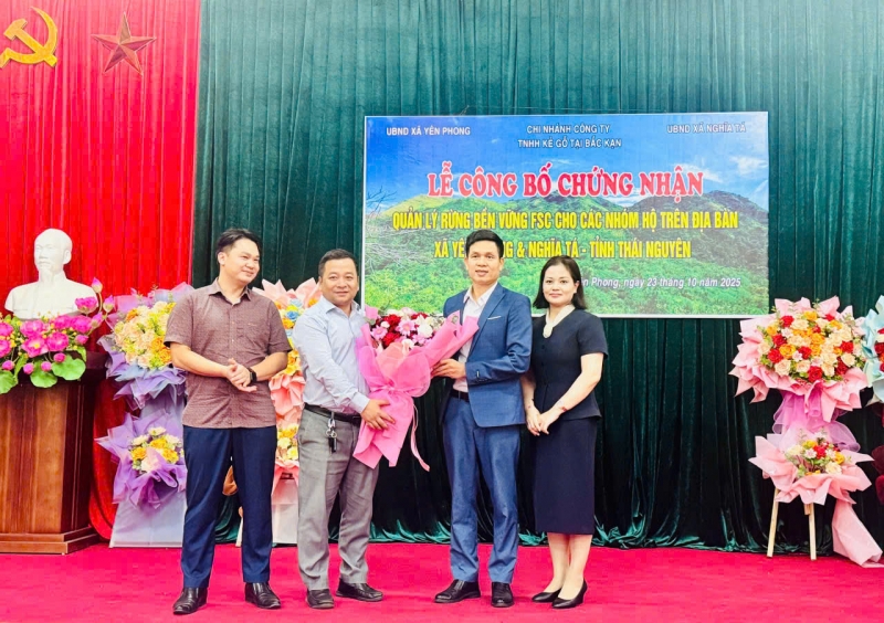 Ngày 23 tháng 10 năm 2025, tại tỉnh Thái Nguyên, UBND các xã Yên Phong, Nghĩa Tân và Chi nhánh Công ty TNHH Kẻ Gỗ tại tỉnh Bắc Kạn cũ (nay là tỉnh Thái Nguyên) tổ chức Lễ công bố chứng nhận quản lý rừng bền vững cho các nhóm hộ trên địa bàn tỉnh Thái Nguyên.